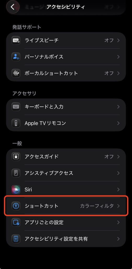 そこで「アクセシビリティ」の下の方にある「ショートカット」を選択し、「サイドボタンのトリプルクリック」に「カラーフィルタ」だけにチェックをつけておくと、サイドボタンのトリプルクリックでモノクロ/カラーの切り替えができるようになります。